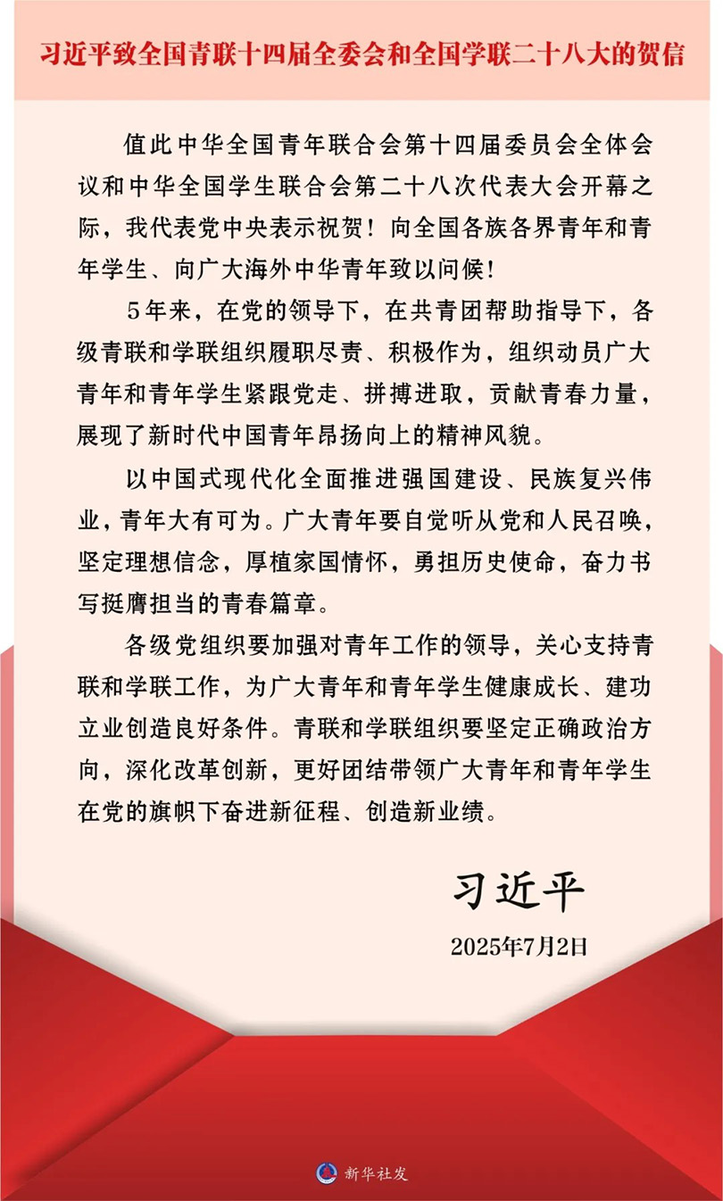 7月2日-3日,中华全国青年联合会第十四届委员会全体会议和中华全国学生联合会第二十八次代表大会胜利召开。中共中央总书记、国家主席、中央军委主席习近平致贺信,对广大青年提出殷切期望,希望大家自觉听从党和人民召唤,坚定理想信念,厚植家国情怀,勇担历史使命,奋力书写挺膺担当的青春篇章。