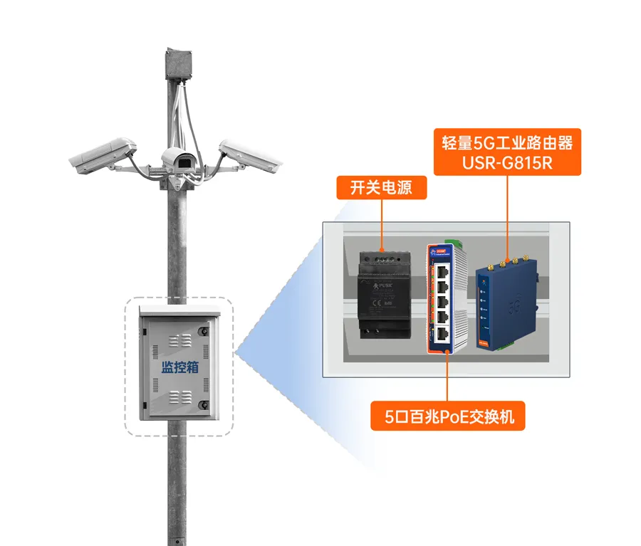 1、监控箱体导轨式安装:轻量5G工业路由G815R、POE交换机